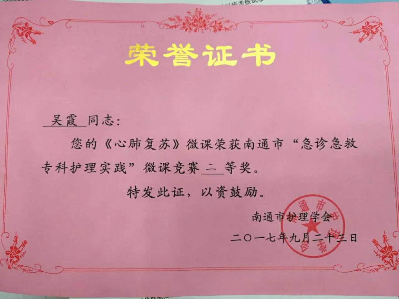 急诊科吴霞的“心肺复苏”微课讲授荣获二等奖。